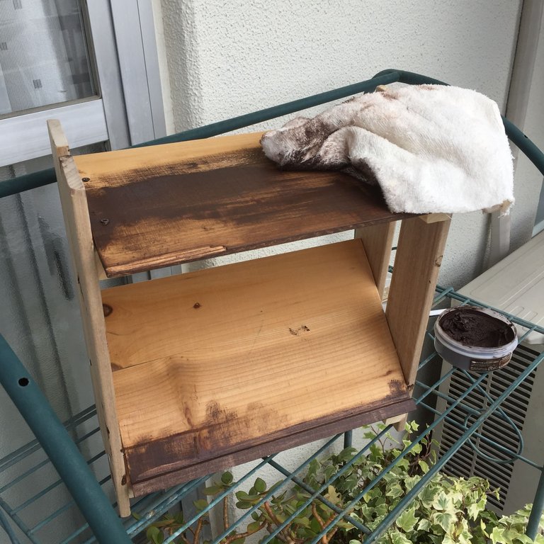 角っこなどの細かい部分は不要な歯ブラシで塗って、広い面は古布でこすり付けながら塗っていきました。