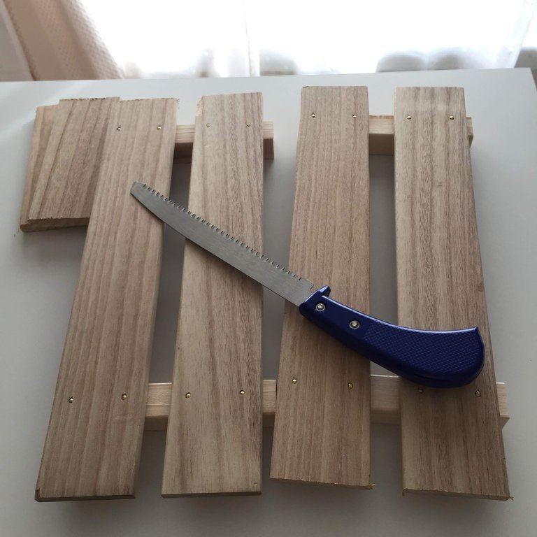 すのこははしごの位置が同じ高さになるようにカットし、ダイソー木板は1/2に等分カット。