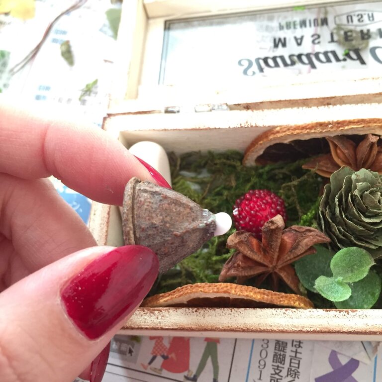 松ぼっくりなど背の高いパーツは、蓋が閉まるか確認しながら付けていきます。