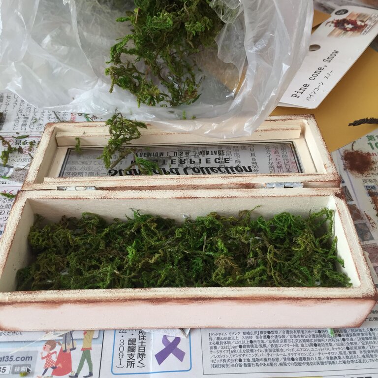仮置きしたパーツを一旦取り出して、フォームの上から木工用ボンドを塗ったら、モスを薄く敷き詰めます。