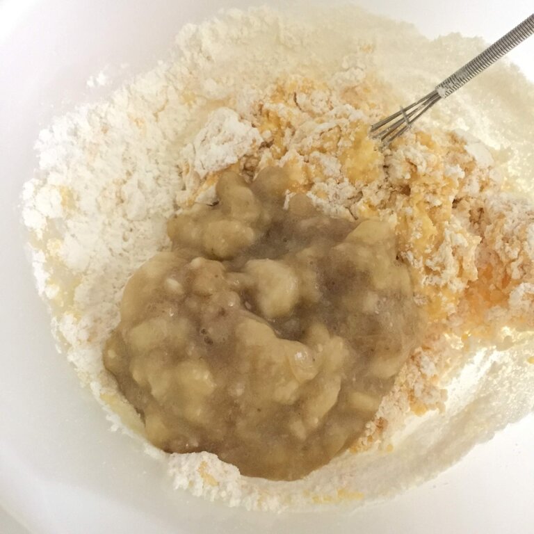 柔らかくしたバナナも合わせて混ぜます。