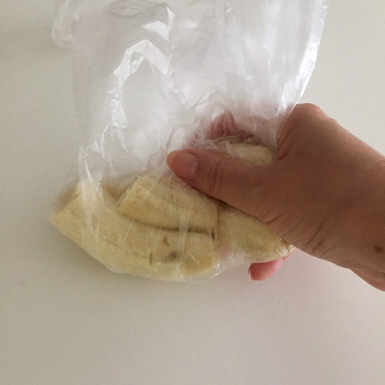 まずビニール袋にバナナを入れて、手で揉んでつぶします。