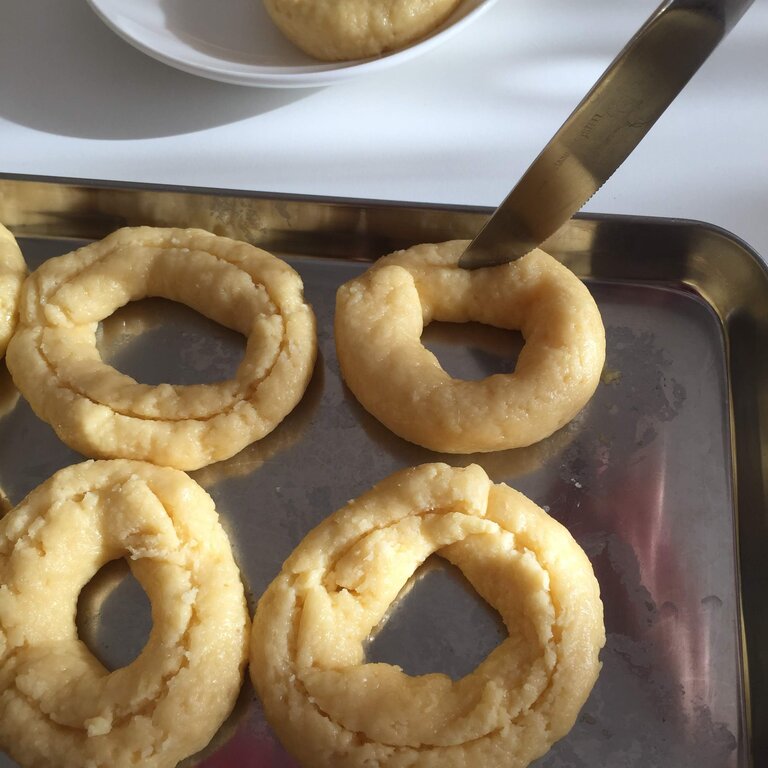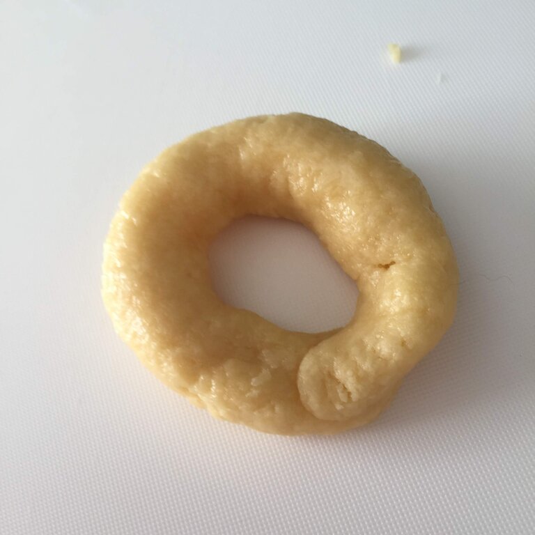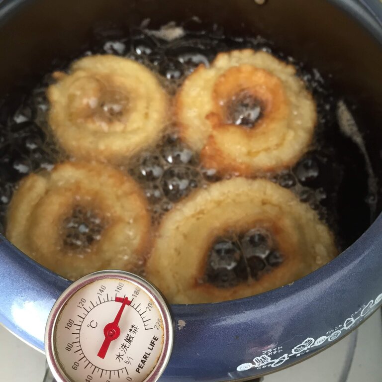 油に入れてドーナッツが浮いてきて、入れた切れ目以外がこんがりした色になったら裏返しにしました。