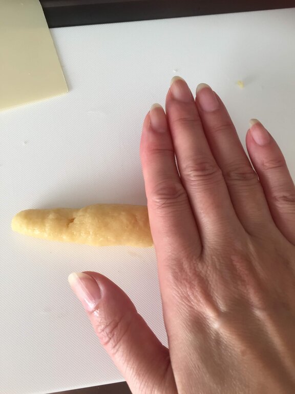 台の上で生地をコロコロして、なるべく均一の太さの棒状にします。
