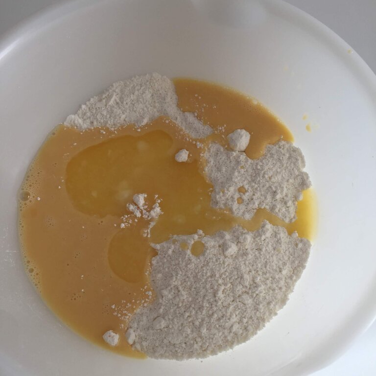 粉類に液体部隊(豆乳・溶いた卵・レンチンで溶かしたバター)を投入します。