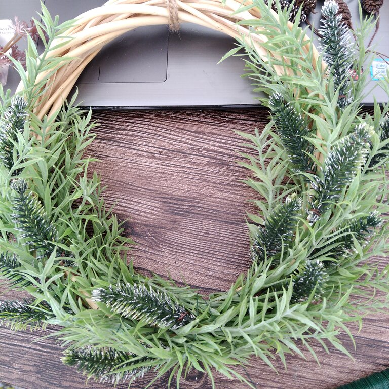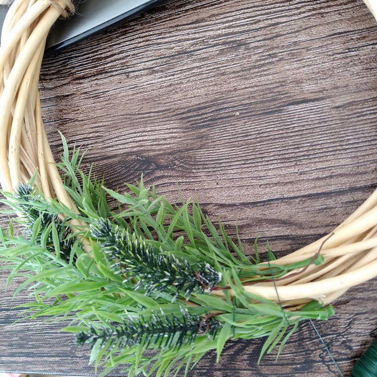 リース台の大体上下半分の位置に巻き始める葉先がくるようにして、そこからスタート地点で巻き始めます。