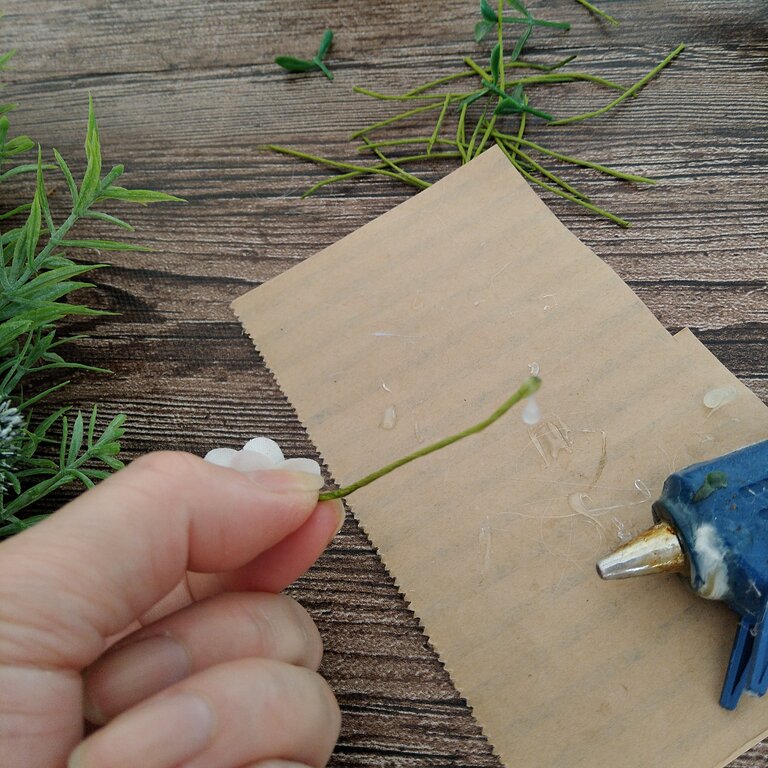 メイン花材を付けたら、サブ花材をカットして仮置き→グルーガンで本留めしていきます。