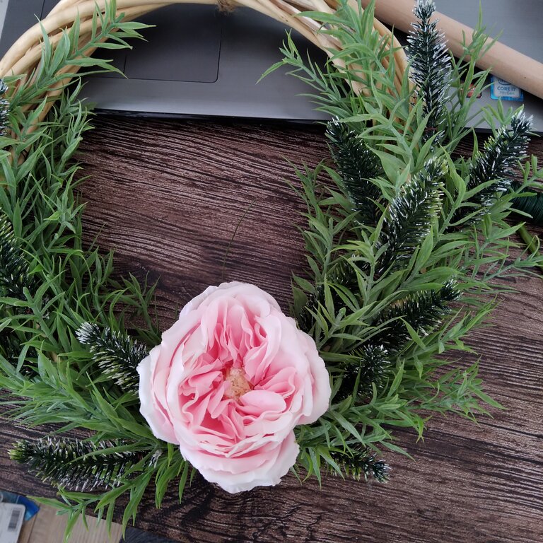 この時点で「クリスマスなのに、なんか寂しいリースやな~」と思い、花材をプラスしました